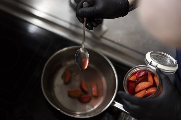 Alle zwei Monate erwartet die Gäste eine neue Karte. Die Gerichte tragen keine exotischen Namen; Simon listet einfach die Zutaten auf. «Damit lasse ich mir mehr kreativen Spielraum fürs Anrichten.» Darin steckt viel Herzblut. Das zeigt der Teller mit gegrillten Ochsenherztomaten, Süsskartoffeln und flambierten Pfirsichen, den er bereitstellt. Zusammen mit dem exquisiten Habanero-Espuma-Topping ein gelungenes Geschmackserlebnis! Die leichte Schärfe öffne die Geschmacksknospen. So intensivieren sich die weiteren Aromen des Gerichts – das ist Simons Intention. Und nicht nur geschmacklich achtet der Koch auf jedes Detail, sondern auch bei der Präsentation. «Die Tellersprache ist mir wichtig. Bei diesem Gericht ist das Thema ‹rot›.»